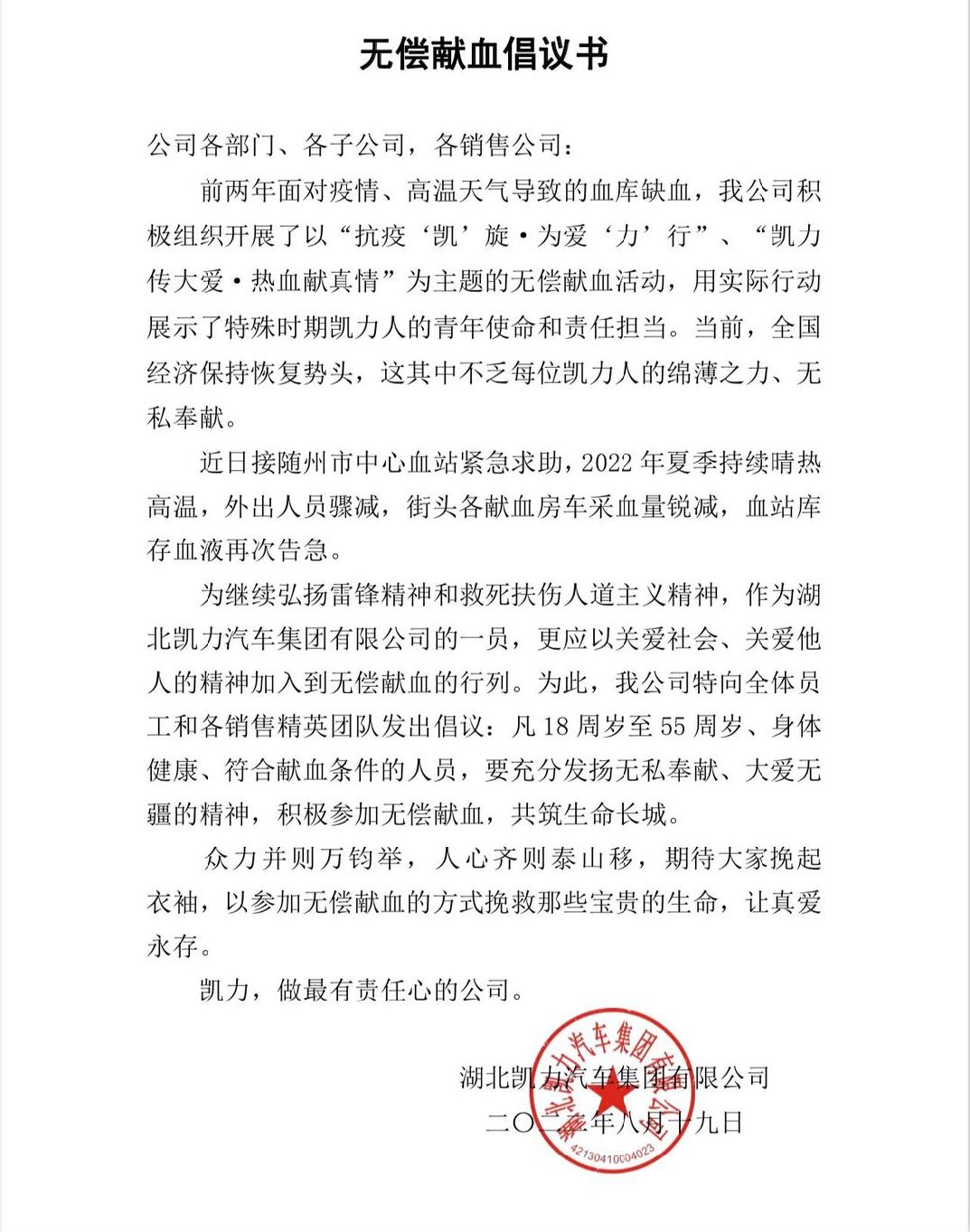 To Unite Love With Passion, To Demonstrate Dedication Through Action, To Ensure The Normal Prevention And Control Of The Epidemic And The Supply Of Medical Blood Throughout The City During High Temperatures, To Meet Medical Needs, And To Dedicate The Love Of Dedicated Professionals To The Safety And Health Of The People In Suizhou City. On August 24th, Kaili Automobile Group Actively Responded And Launched A Voluntary Blood Donation Public Welfare Activity With The Theme Of "Kaili Conveys Great Love, Passionate Blood And Sincere Love", Adding Valuable Blood To The Blood Bank In Suizhou City That Is Frequently In Urgent Need.